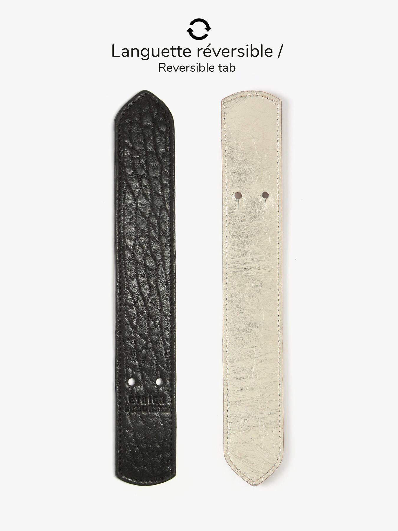 Le sac porté bandoulière AGNES par ETRIER est conçu en cuir de mouton crispé français. Ce modèle est présenté ici en taille M et se ferme par un rabat doté d'un bouton-pression aimanté. Il existe également en taille S pour celles et ceux qui souhaitent une contenance plus généreuse. Ce dernier est également agrémenté d'une languette réversible ; une face dorée et une face en cuir assortie au reste du sac, qui se fixe facilement grâce à deux boutons de col et se glisse dans une poche arrière prévue à cet effet.