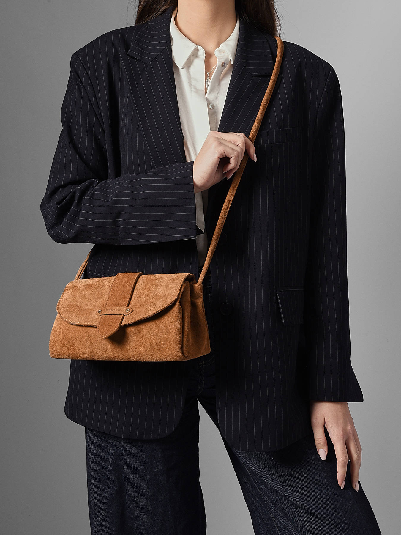 Le sac porté bandoulière AGNES signé ETRIER est conçu en France dans cuir velours italien, offrant une texture douce et raffinée. Ce modèle est présenté ici en taille M et se ferme par un rabat doté d'un bouton-pression aimanté. Il existe également en taille S pour celles et ceux qui préfèrent un format plus compact. Le sac est agrémenté d'une languette réversible, composée d'une face dorée et d'une face en cuir assortie au reste du sac. Elle se fixe aisément grâce à deux boutons de col et se glisse dans une poche arrière prévue à cet effet.