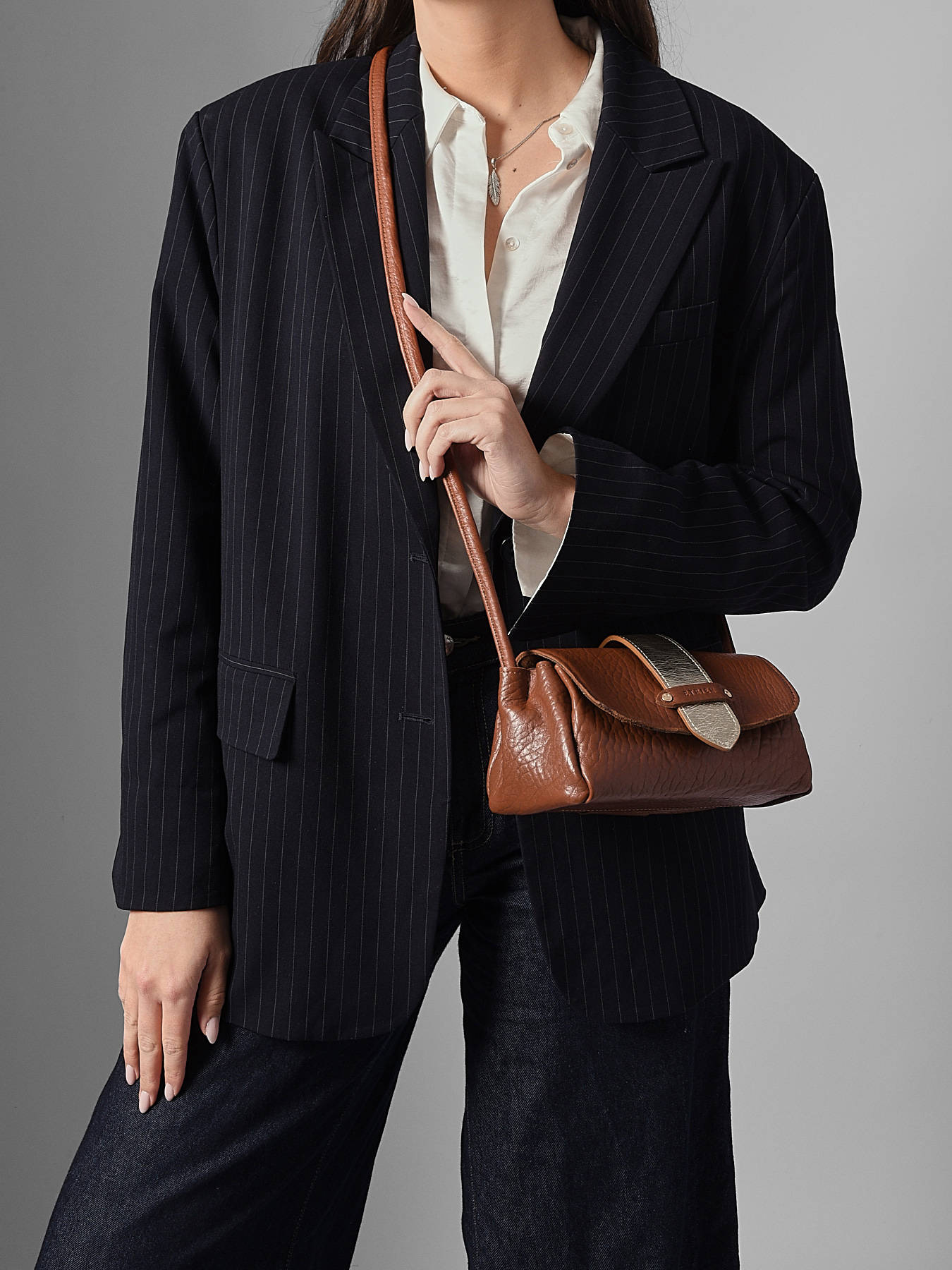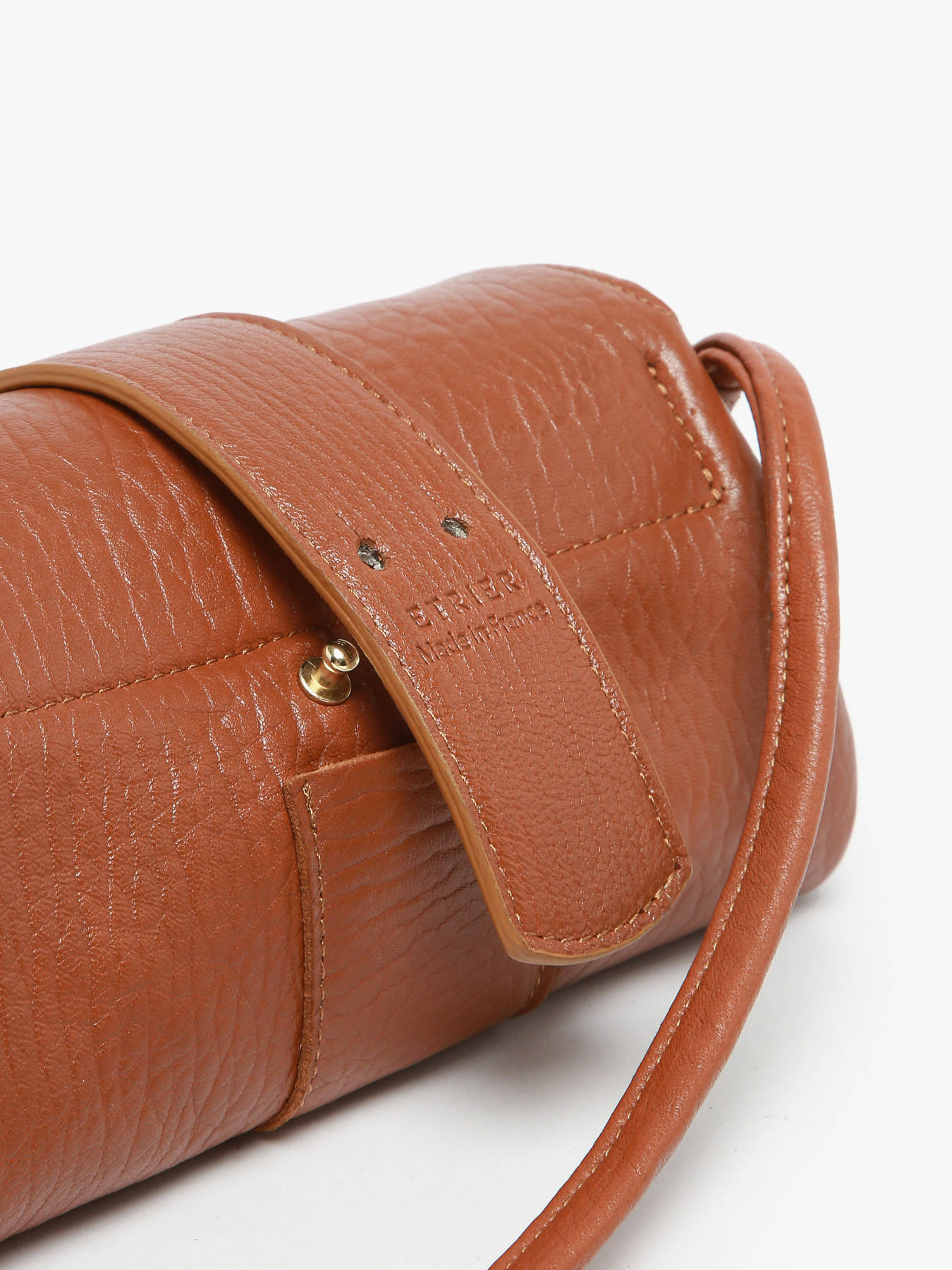 Le sac porté bandoulière AGNES par ETRIER est conçu en cuir de mouton crispé français. Ce modèle est présenté ici en taille S et se ferme par un rabat doté d'un bouton-pression aimanté. Il existe également en taille M pour celles et ceux qui souhaitent une contenance plus généreuse. Le sac est agrémenté d'une languette réversible, avec une face dorée et une face en cuir assortie au reste du sac. Elle se fixe facilement grâce à deux boutons de col et se glisse dans une poche arrière prévue à cet effet.